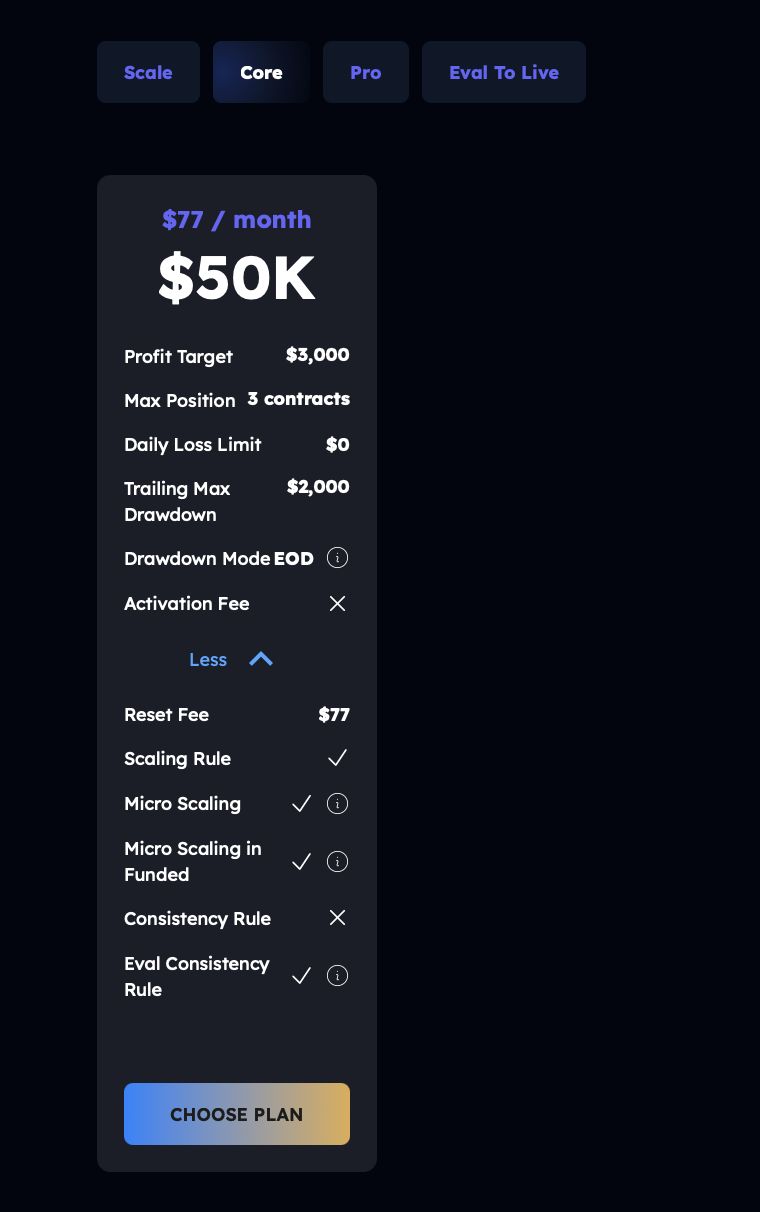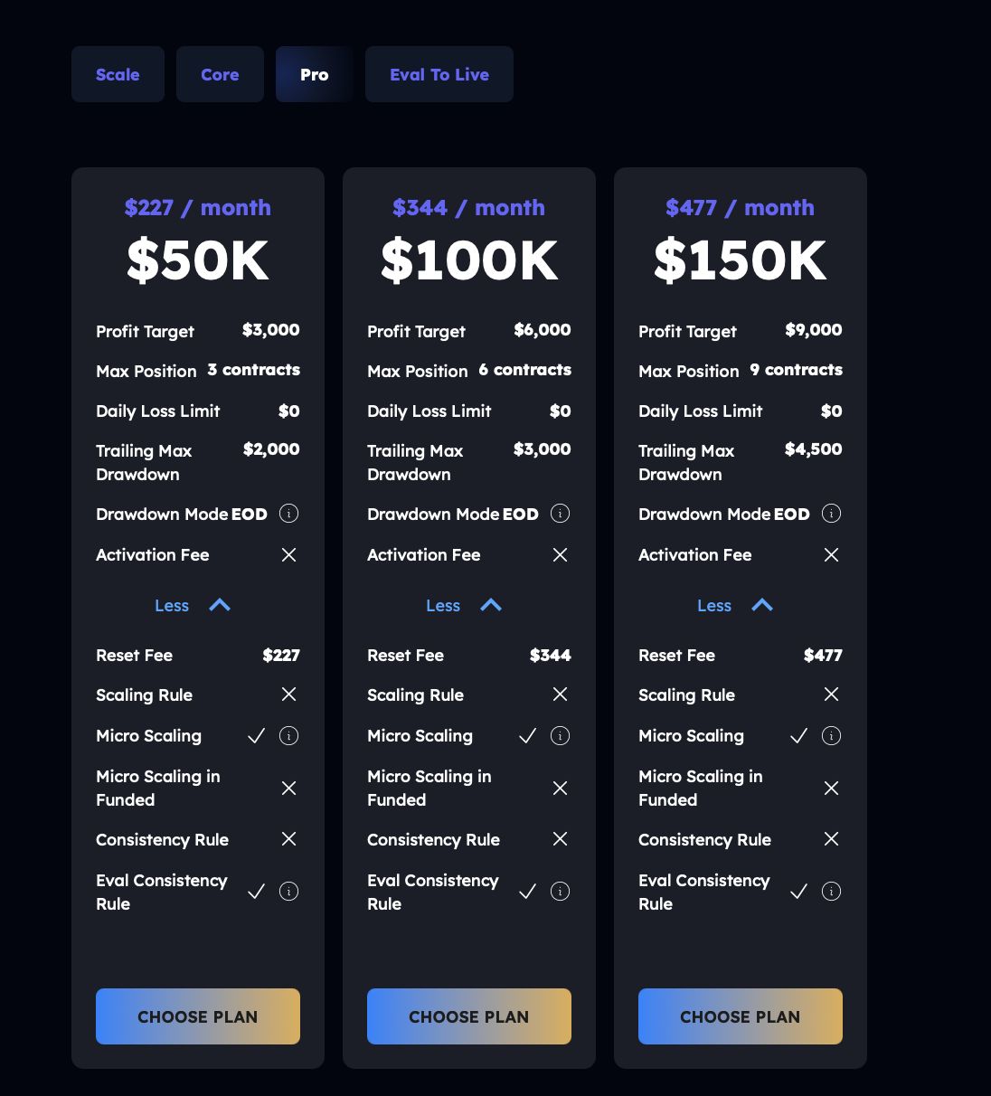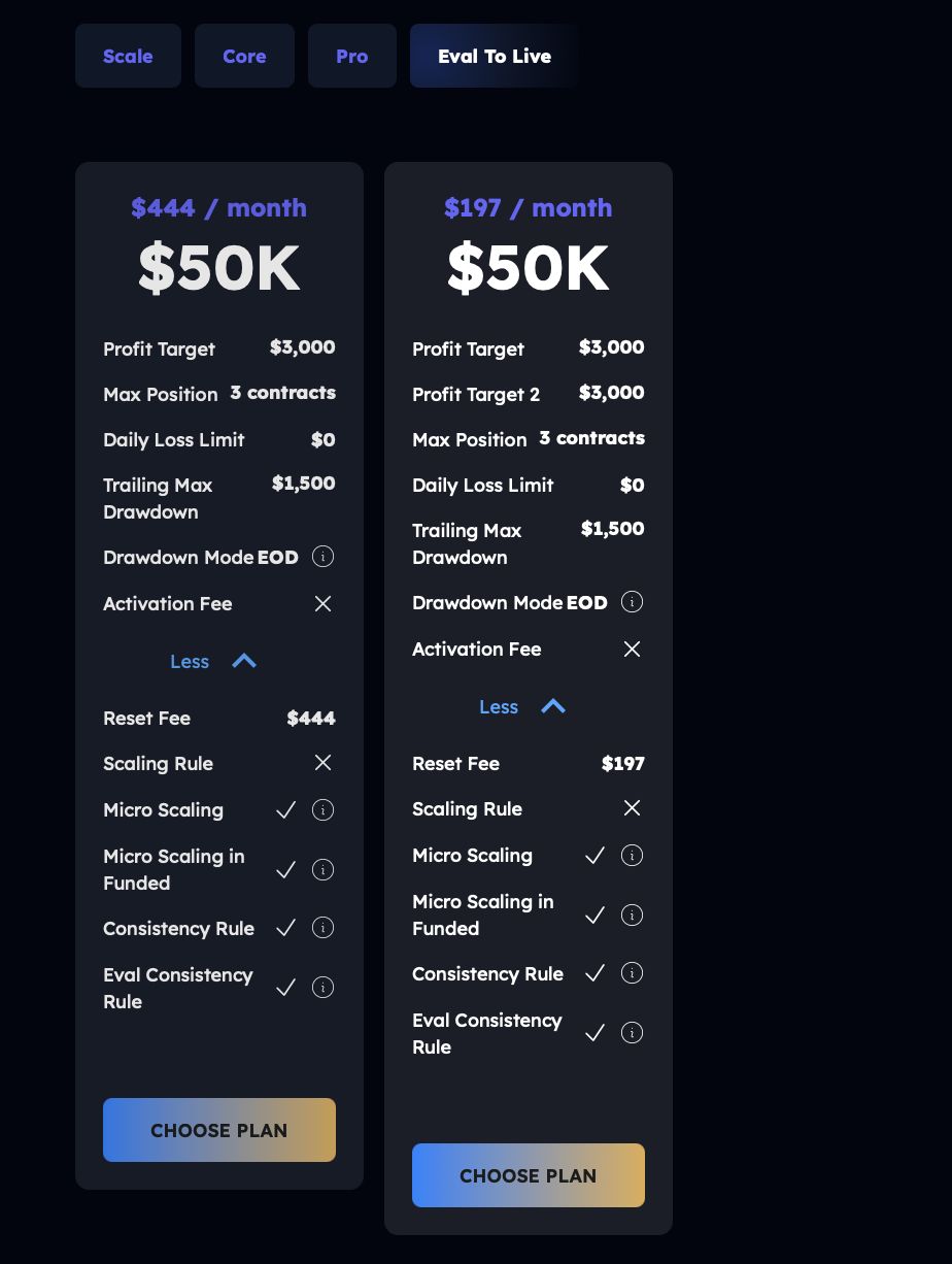 - Micro scaling in Funded is available on Scale, Core, and Eval-to-Live but not on Pro accounts.