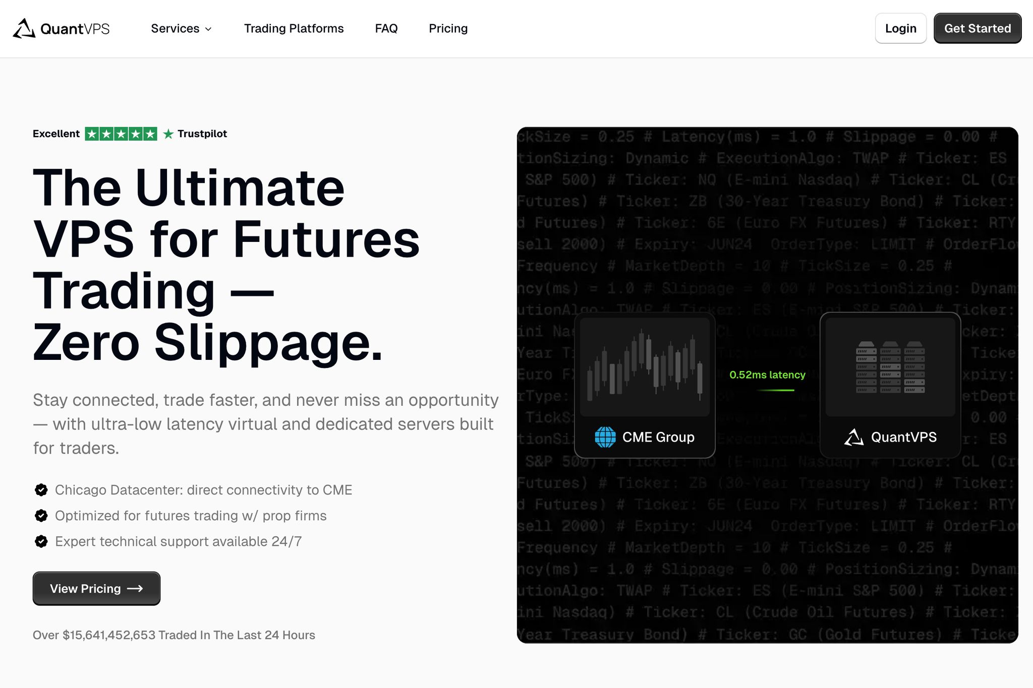 QuantVPS stands out as a VPS provider tailored specifically for futures trading. Founded by Ethan Brooks, the company focuses on delivering the ultra-low latency and high performance that professional and algorithmic traders demand. Its primary emphasis is on serving major exchanges, particularly the Chicago Mercantile Exchange (CME). QuantVPS is a trading-focused VPS provider tailored for futures and forex traders who require top-tier performance. It prioritizes ultra-low latency for zero slippage.