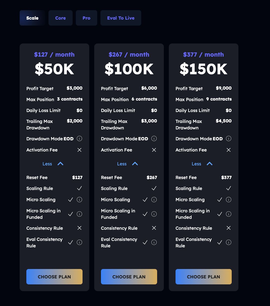 - Micro scaling in Funded is available on Scale, Core, and Eval-to-Live but not on Pro accounts.