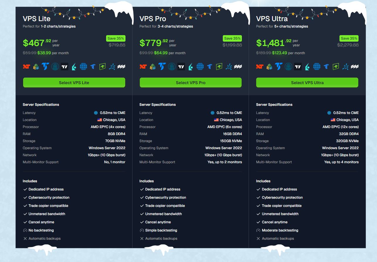 The Santa Sale is here, offering an exclusive 35% discount - the biggest savings of the year. Once the sale ends, pricing returns to the standard rates: full monthly costs or the usual 20% annual discount. Normally, QuantVPS gives you around 20% off with annual billing compared to monthly payments. But this sale takes it a step further, giving you a rare chance to lock in professional-grade trading tools at an unbeatable price. This special deal is only available for a short time, and once it’s gone, so is the opportunity to save big.